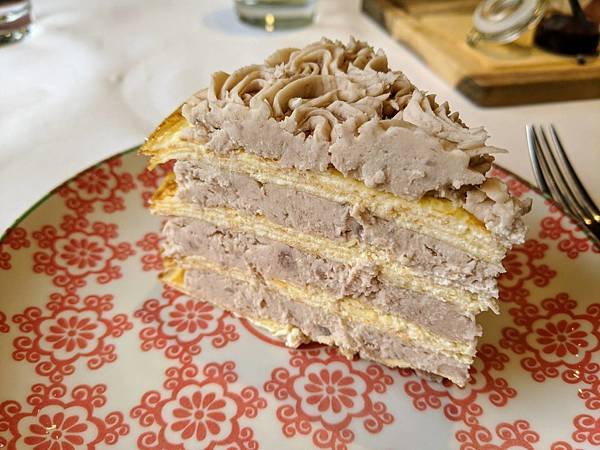雖然說是芋頭千層,但全統跟我們印象中千層薄薄的入口即化不太一樣,招牌的芋泥餡給的大方,每層都將近1cm厚,他們家的芋泥又是走綿密中帶有顆粒感路線的,所以千層整體吃起來雖然綿軟但還存有口感